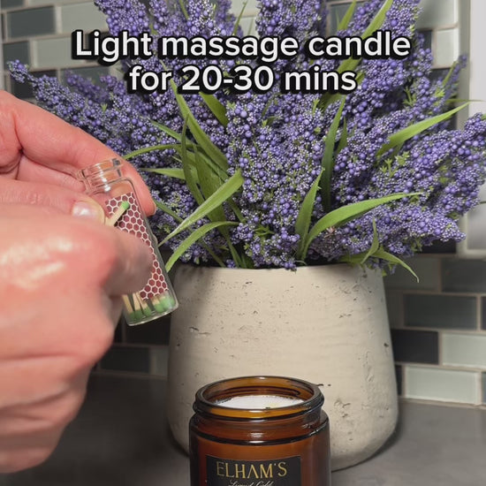 Light the candle and allow it to burn until the wax melts to the edges—about 30 minutes. Use this time to soak in the tub or set the mood. Once melted, extinguish the flame and gently pour the warm oil onto skin for massage or lymphatic wrapping. Use on arms, legs, or the back for a truly sensual and healing experience.